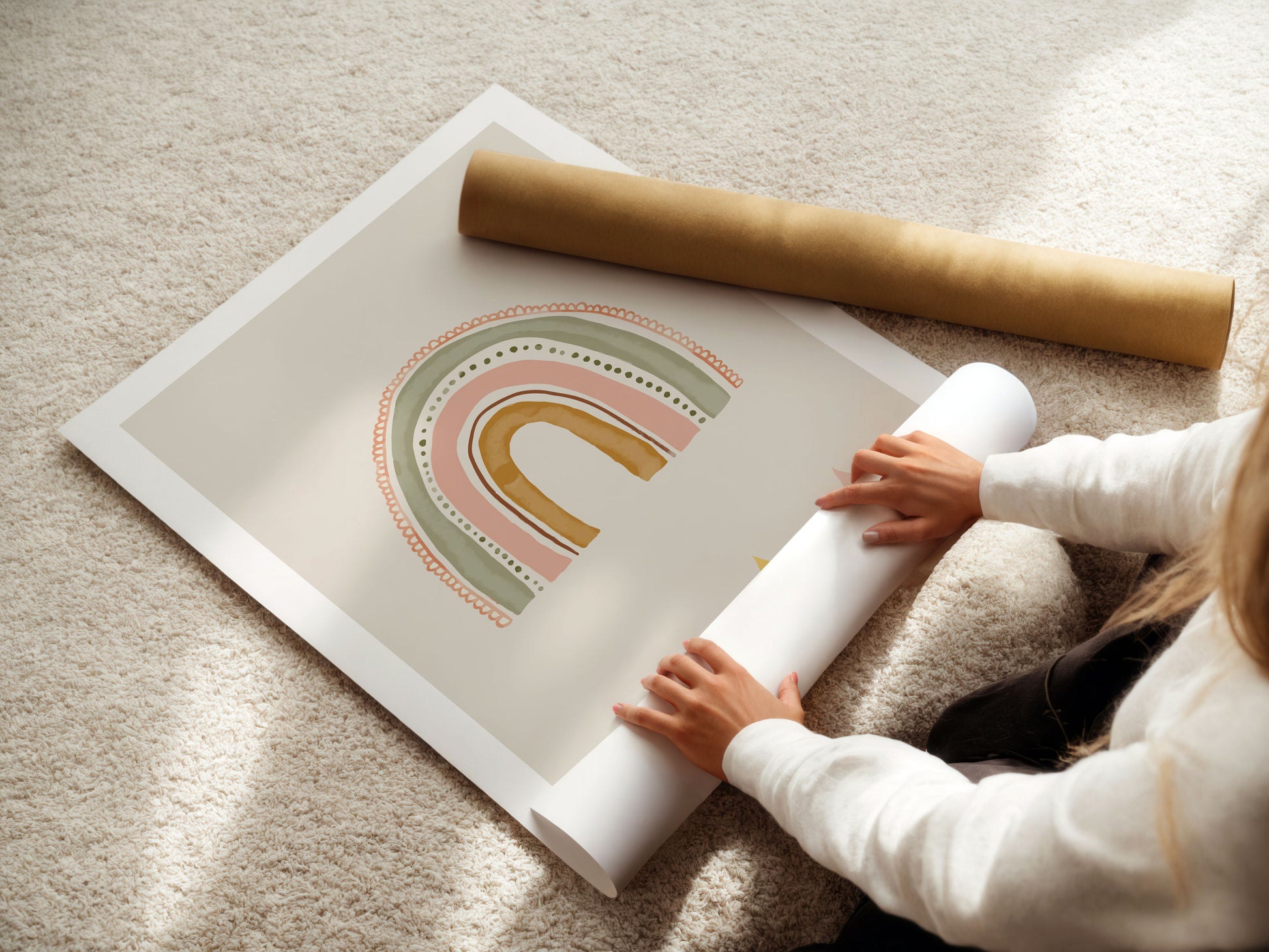 Das aquarell altrosa Boho 3er Poster Set für Mädchenzimmer oder Babyzimmer zeigt auf drei Bildern als graue oder beige Wanddeko einen Regenbogen, eine Sonne und drei Herzen in Pastelltönen. Diese Wandbilder eignen sich nicht nur als Kinderzimmerdeko, sondern auch als Geschenkidee für Kleinkinder, Kinder, Mädchen, Jugendliche, zur Geburt, Taufe, Schulanfang uvm.