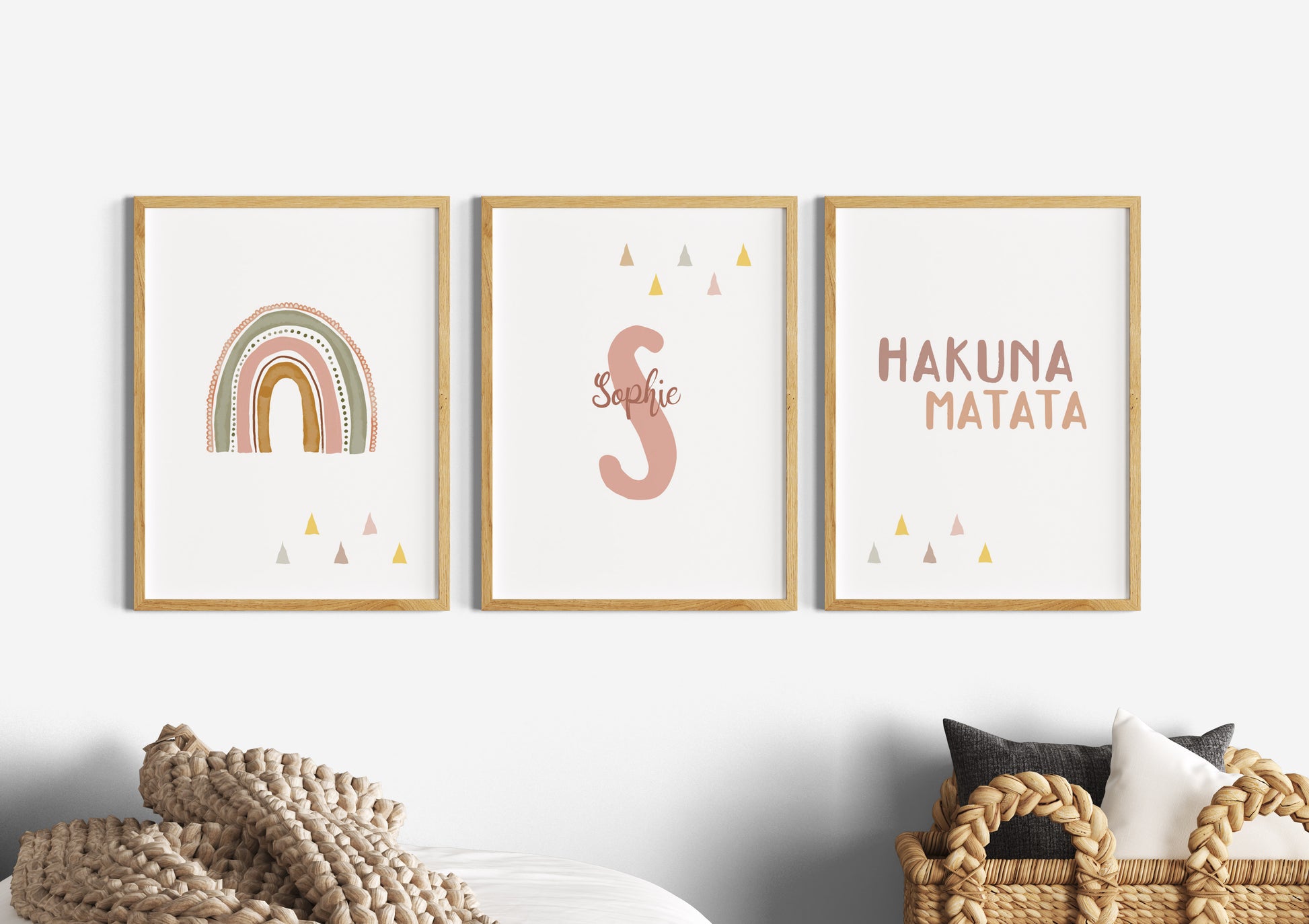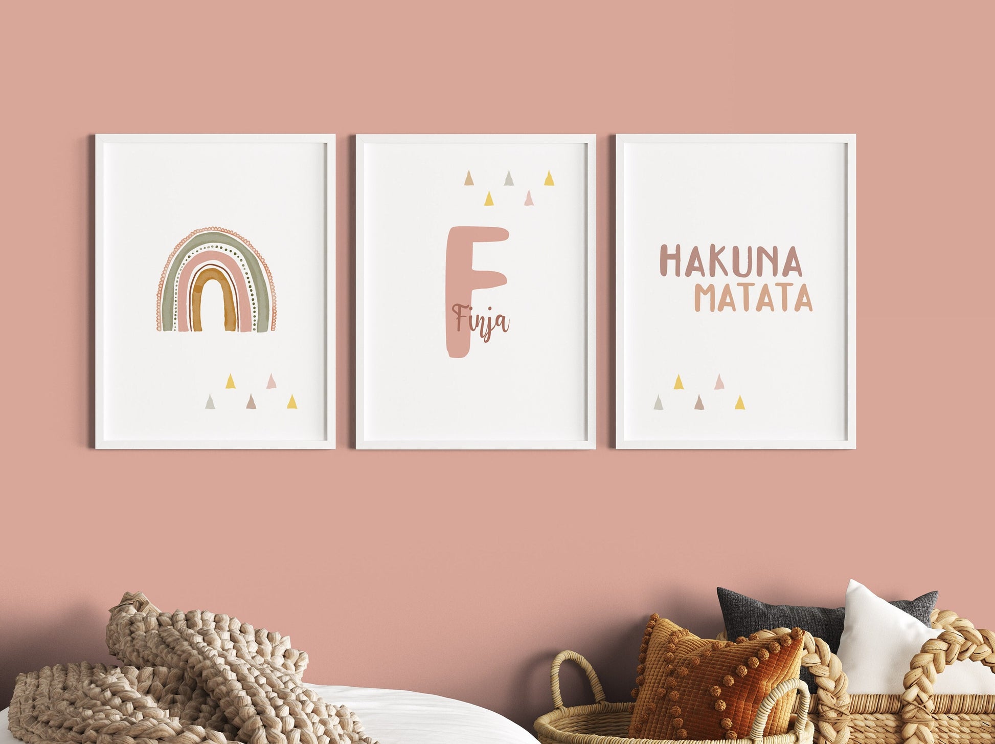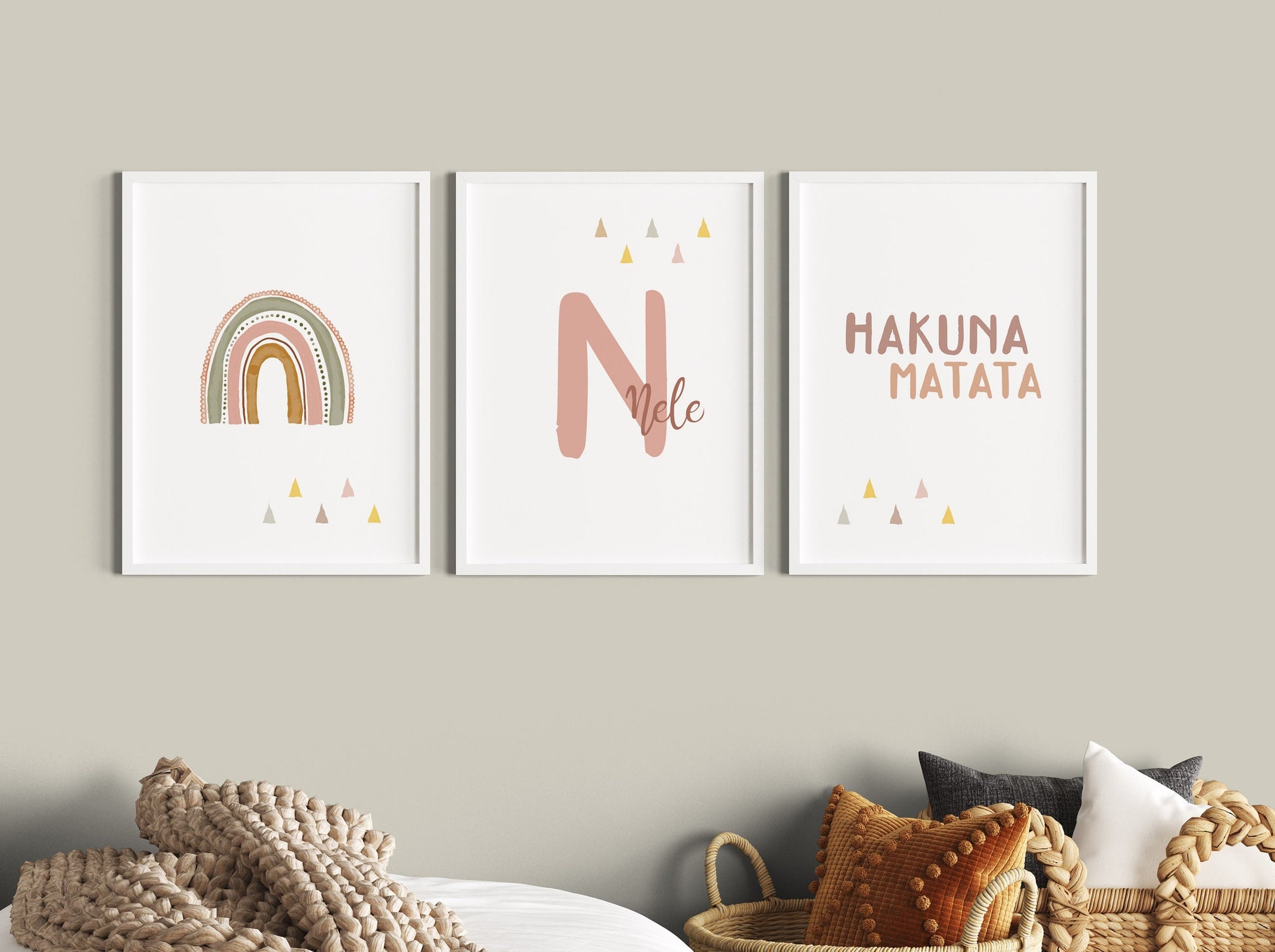 Das aquarell altrosa Boho 3er Poster Set für Mädchenzimmer oder Babyzimmer zeigt auf drei Bildern als  boho Wanddeko einen Regenbogen, den Namen mit Initialen und den Kinderspruch Hakuna Matata oder Glückskind. Dieses Bilderset dient nicht nur als Wandgestaltung Idee, sondern auch als Geschenkidee für Mädchen bzw. Kinder, Kleinkinder und zur Geburt und Taufe.