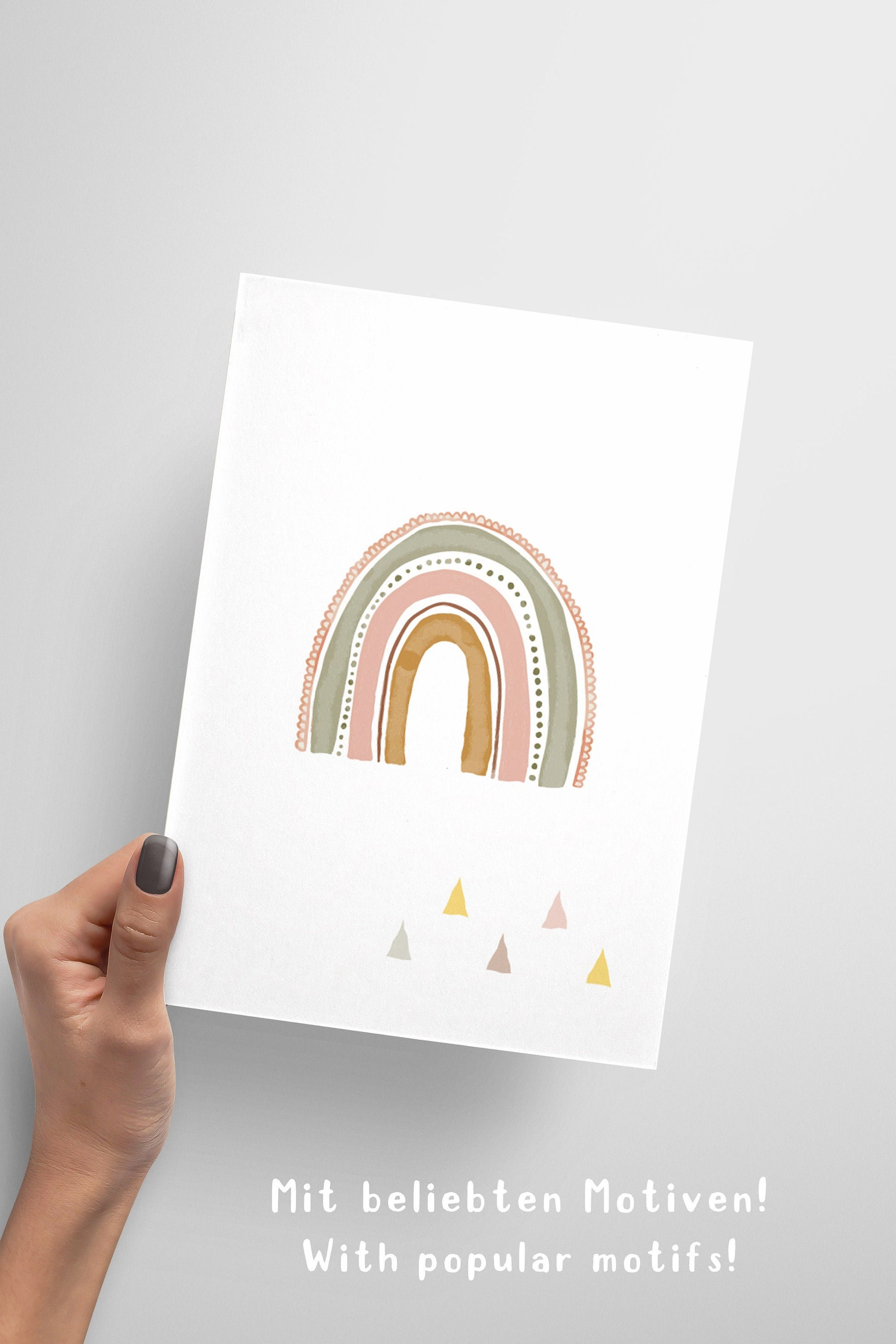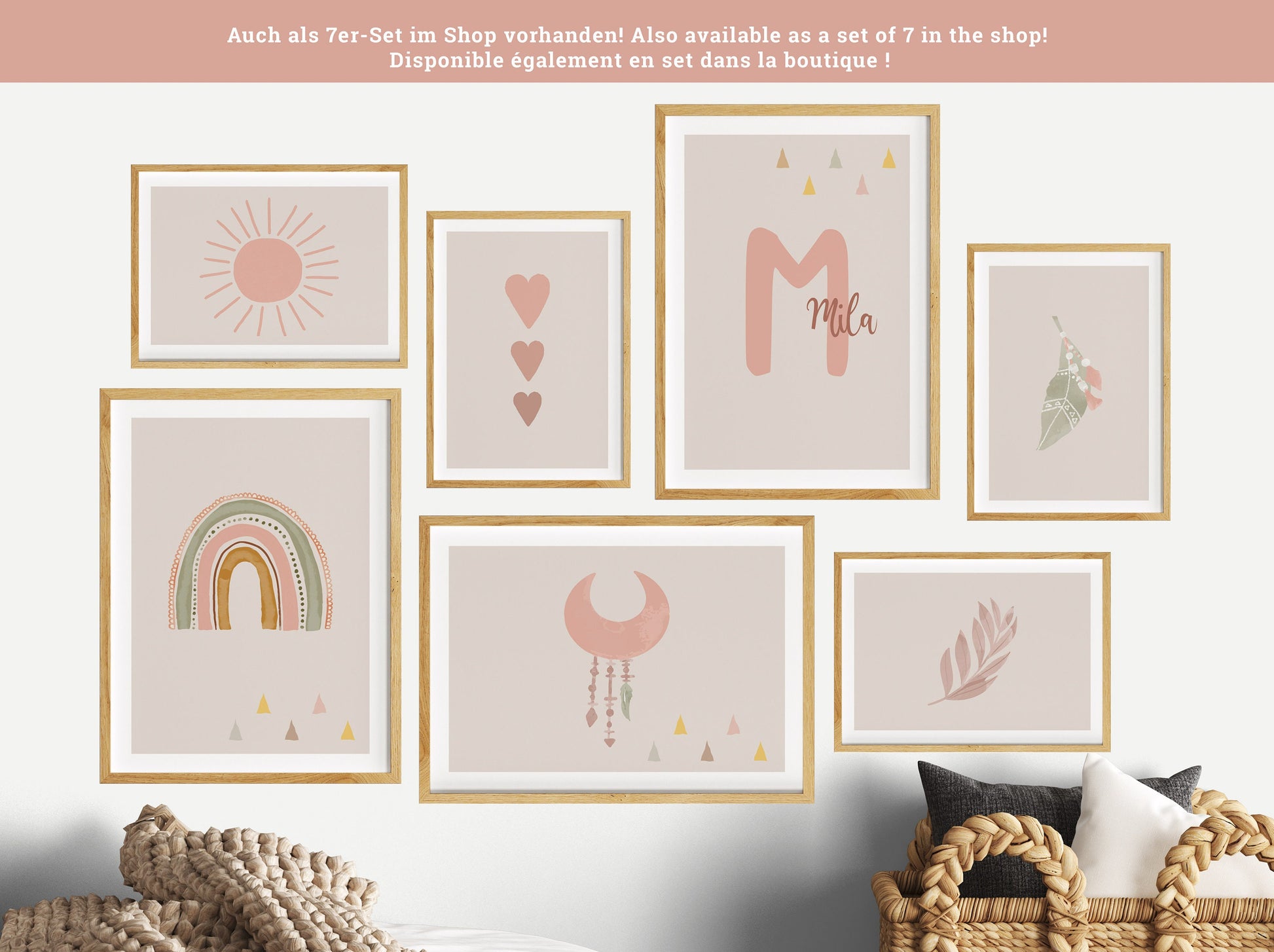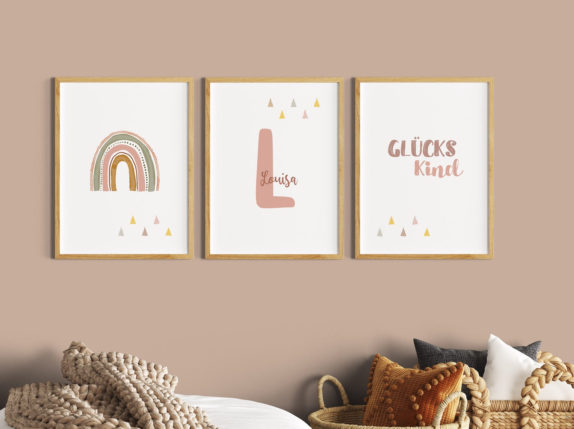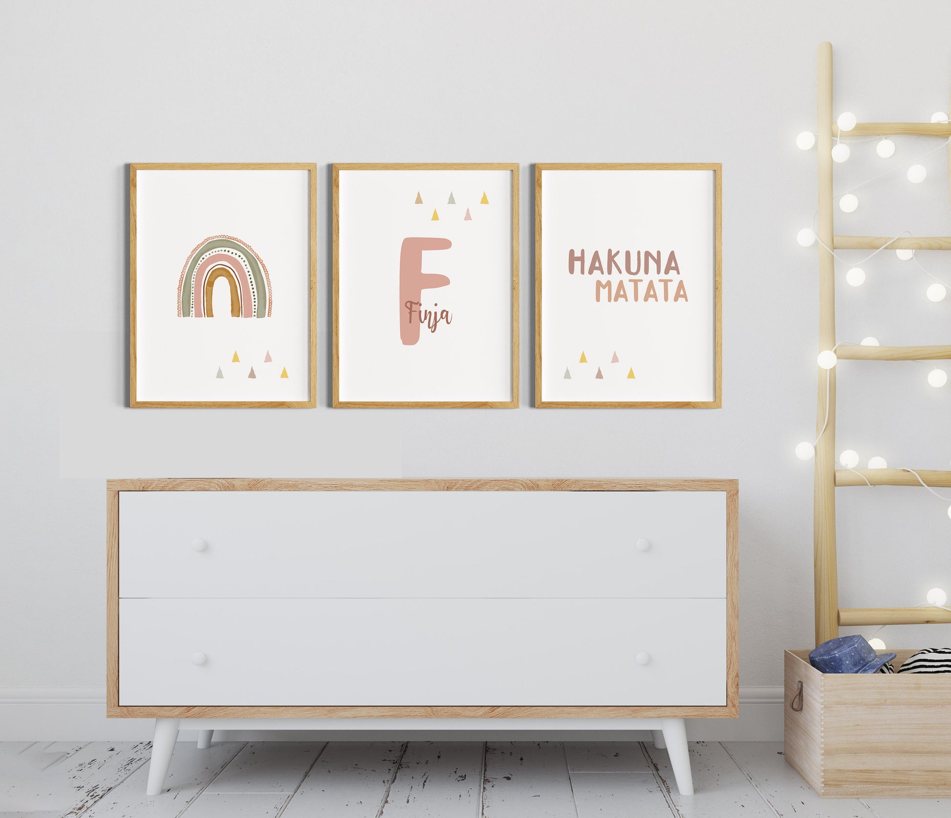 Das aquarell altrosa Boho 3er Poster Set für Mädchenzimmer oder Babyzimmer zeigt auf drei Bildern als  boho Wanddeko einen Regenbogen, den Namen mit Initialen und den Kinderspruch Hakuna Matata oder Glückskind. Dieses Bilderset dient nicht nur als Wandgestaltung Idee, sondern auch als Geschenkidee für Mädchen bzw. Kinder, Kleinkinder und zur Geburt und Taufe.