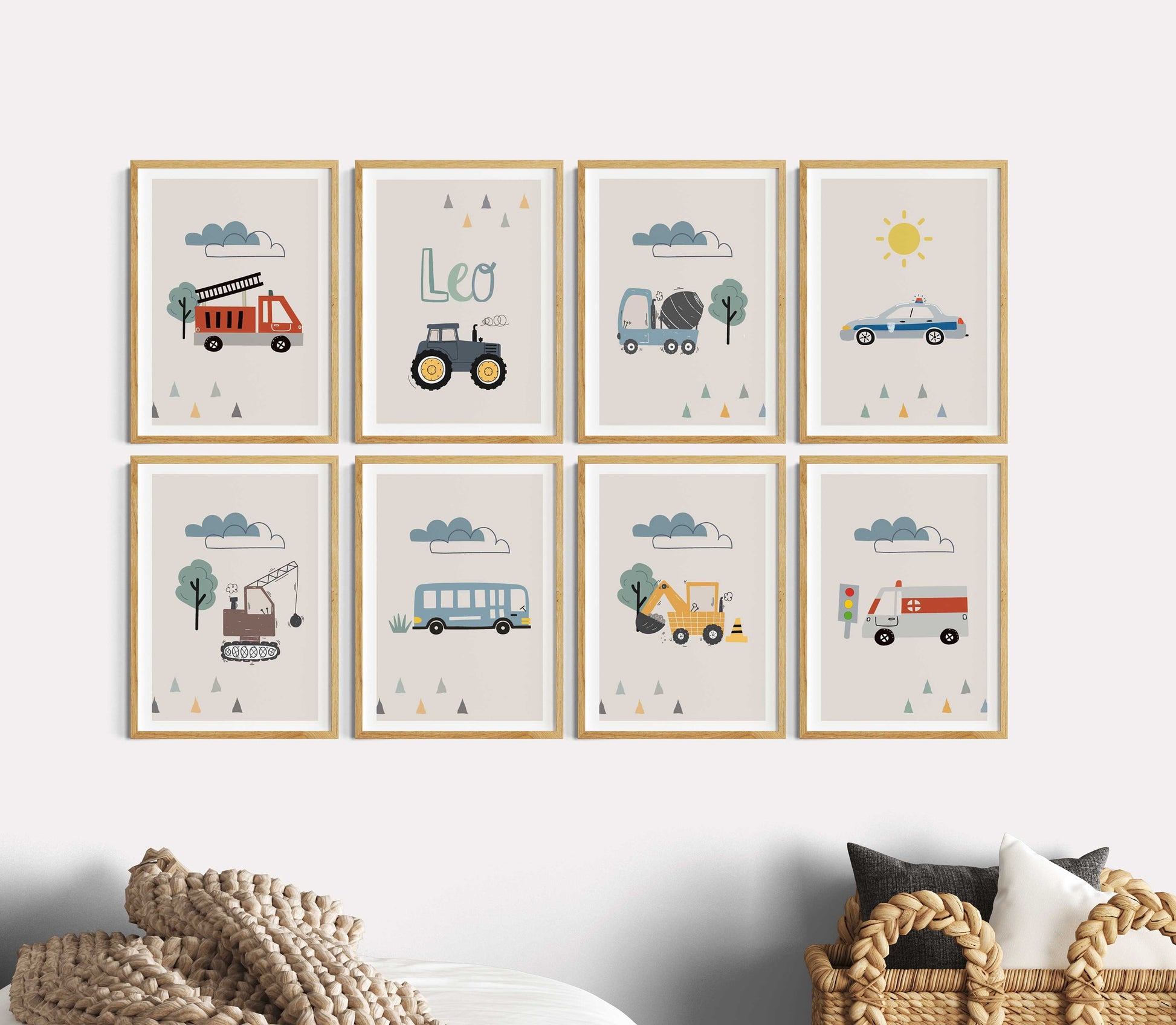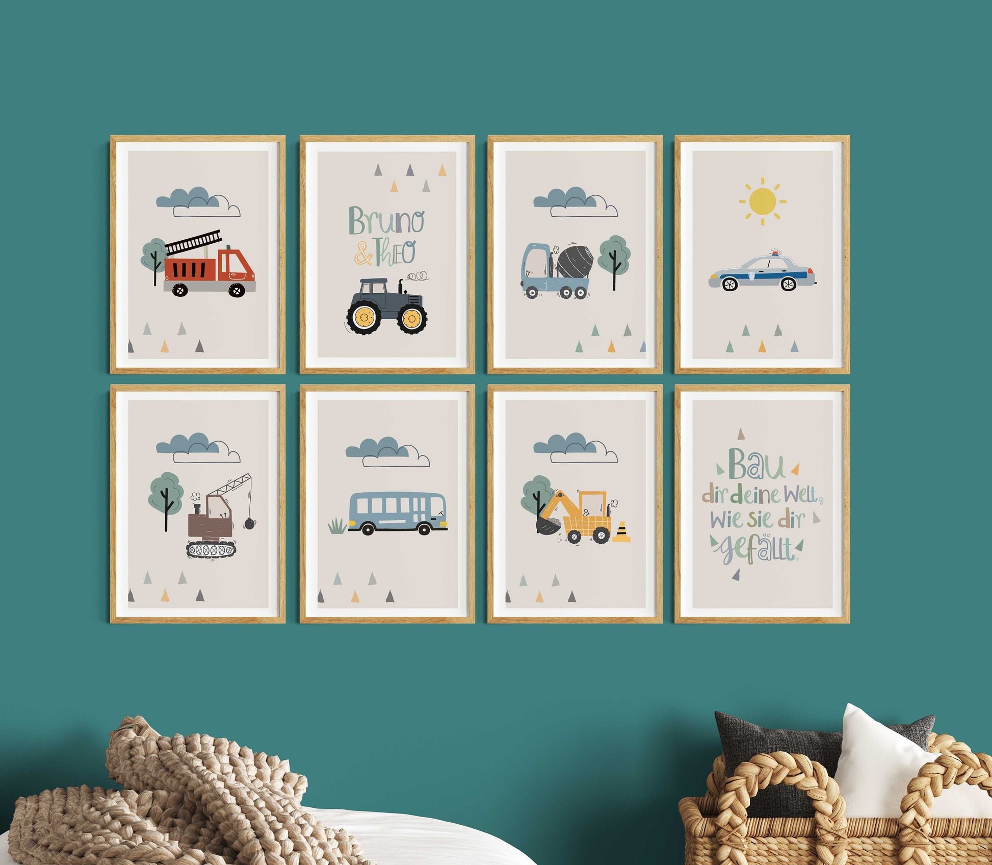 8 Poster als Set mit beliebten Motiven im skandinavischen Stil: Traktor, Feuerwehrwagen, Sonne, Wolken, Betonmischer, Abrissbirne, Polizei Bagger und vieles mehr! Optional mit Namen und einem Kinderspruch auf einem beigen Hintergrund mit einem edlen weißen Rand. Diese Wandbilder eignen sich als Wandgestaltung für das Kinderzimmer, Spielzimmer bzw. Jungenzimmer und auch als Geschenkidee für Kleinkinder und Kinder.
