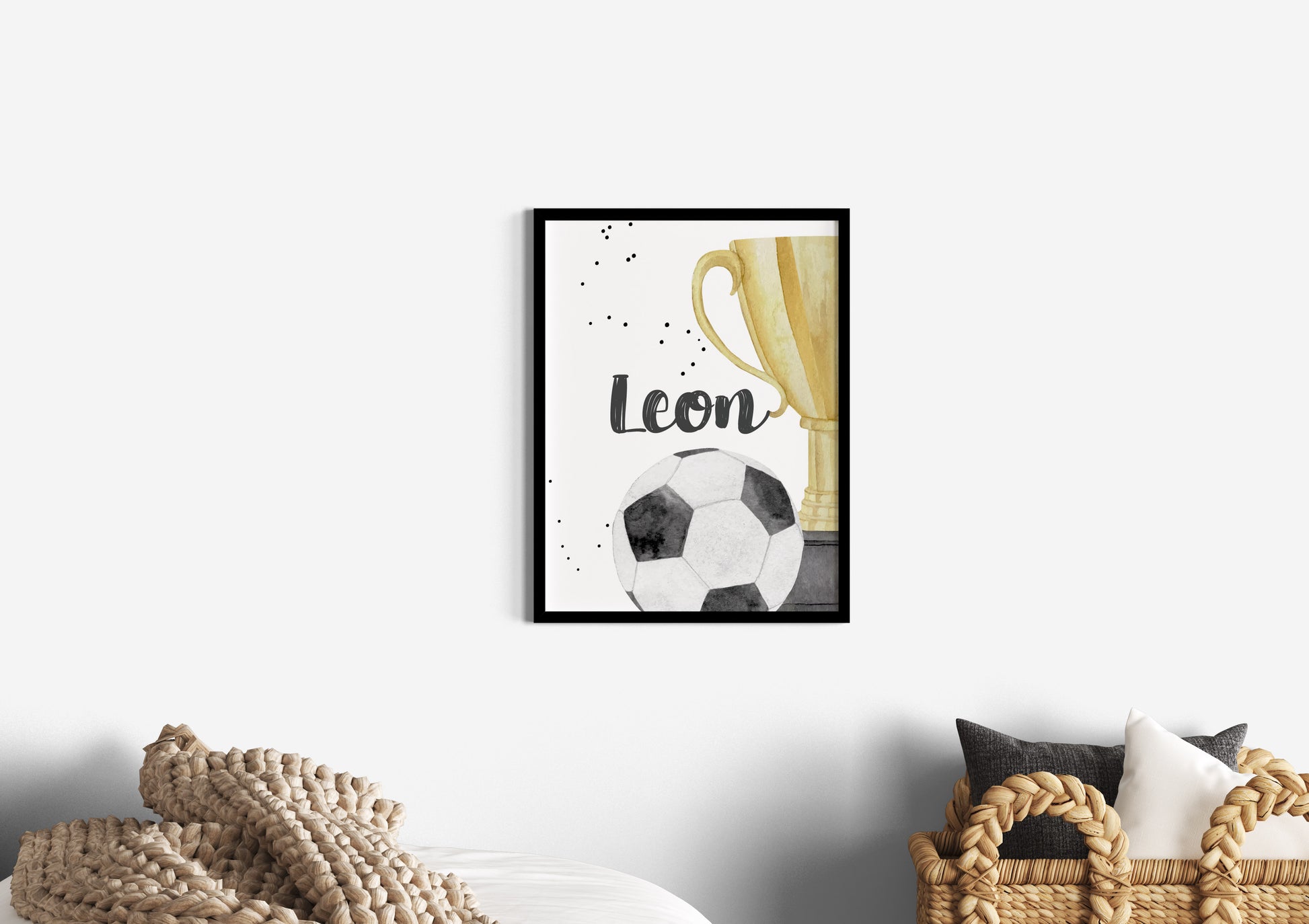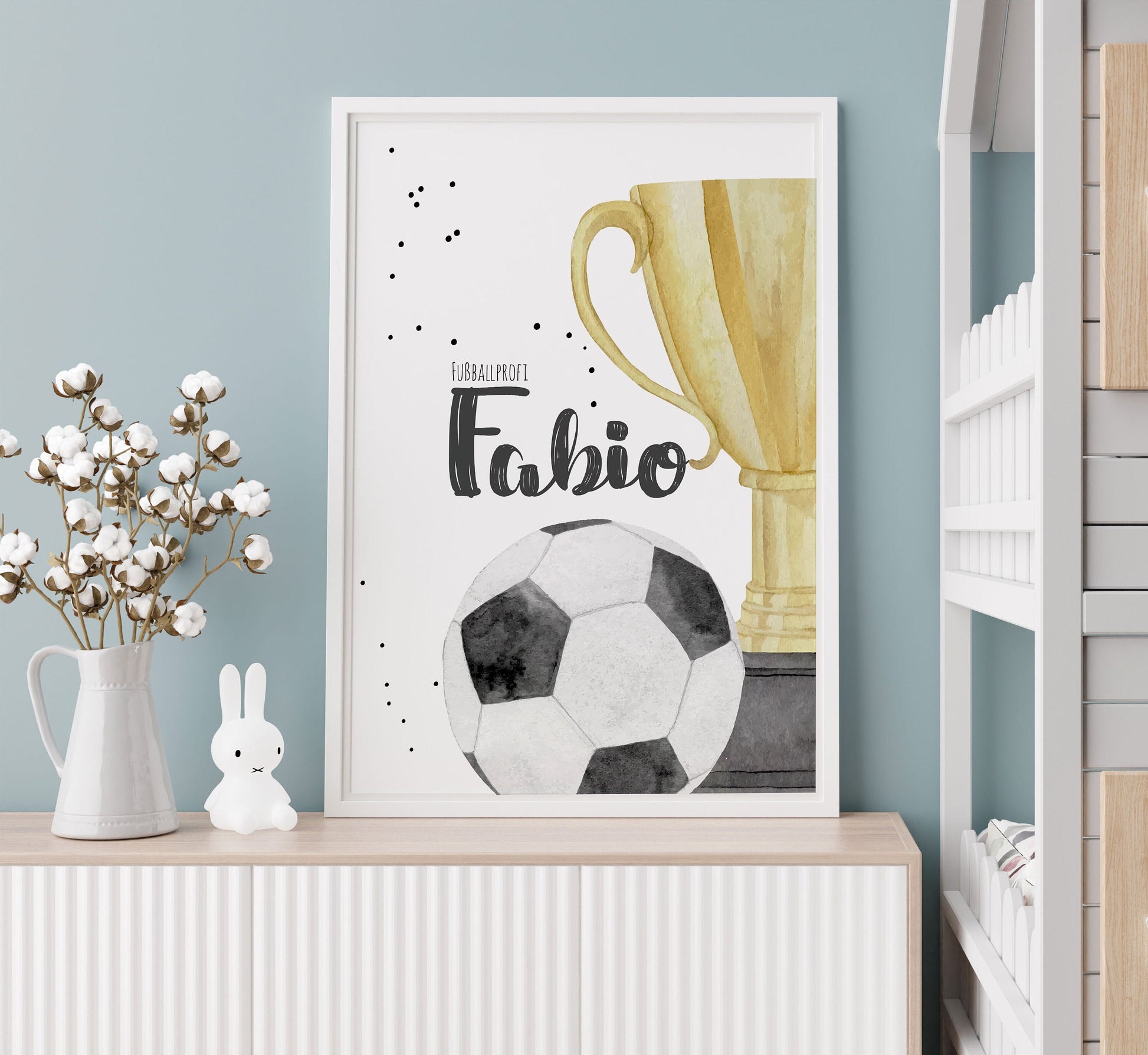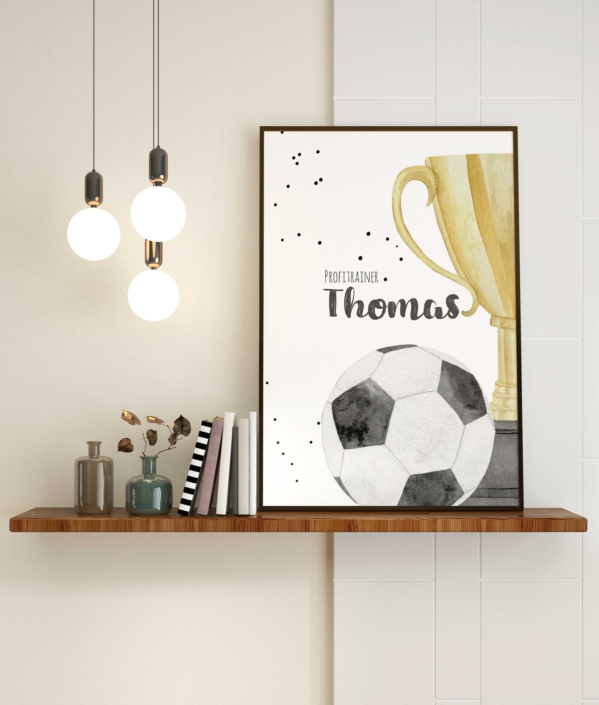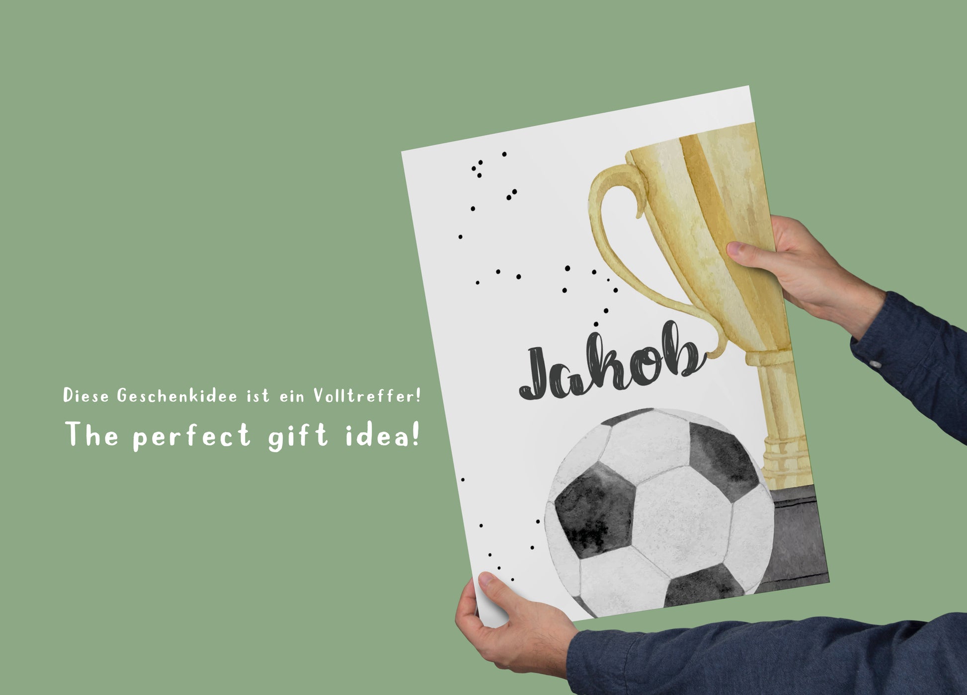 Ein personalisiertes Fußball-Fan Geschenk als Bild mit Namen und wählbarem Titel für Männer und Jungs als Wanddeko im Kinderzimmer, Jugendzimmer, Büro, Spielzimmer oder als Geschenkidee für Fußballbegeisterte.