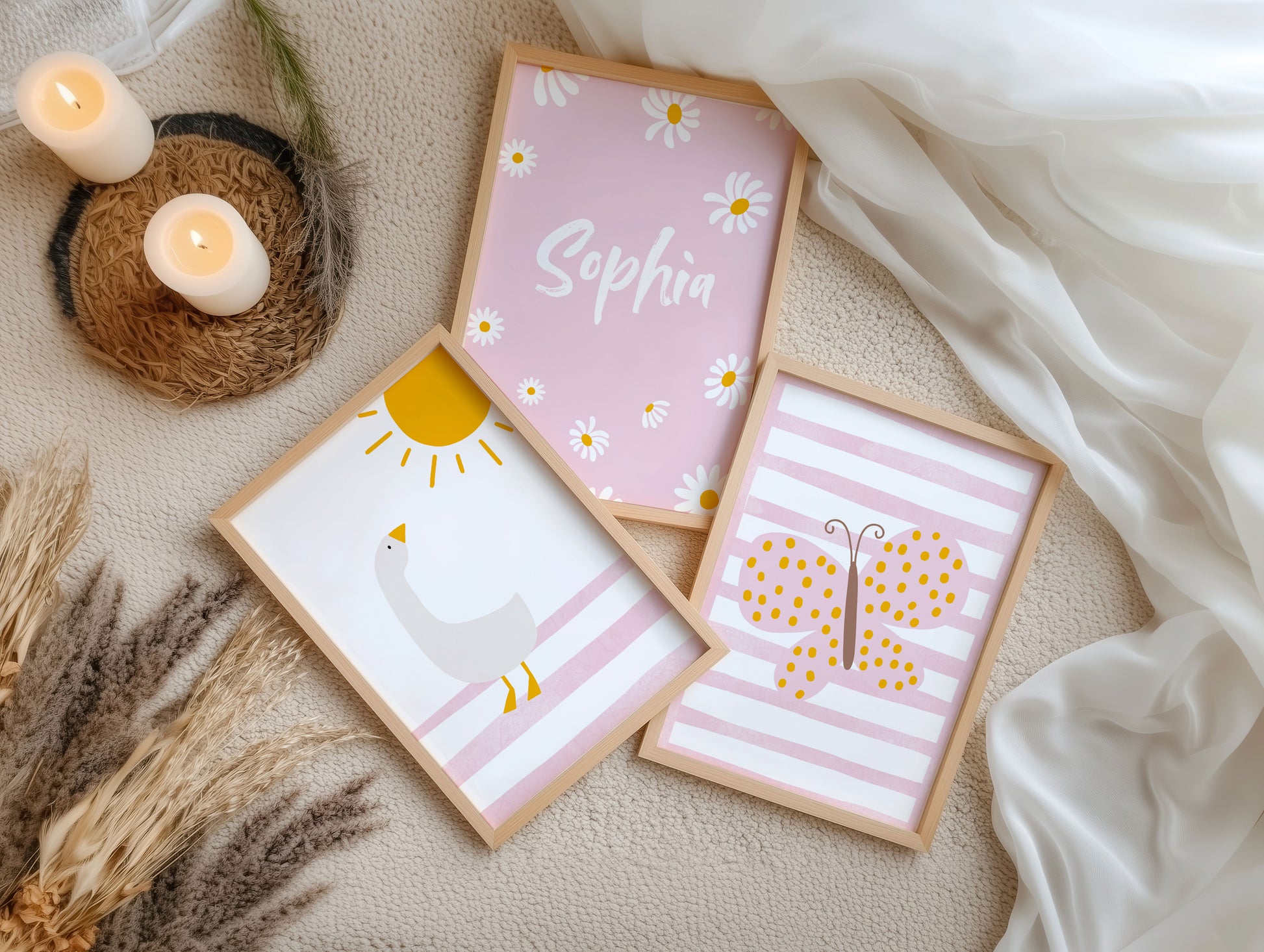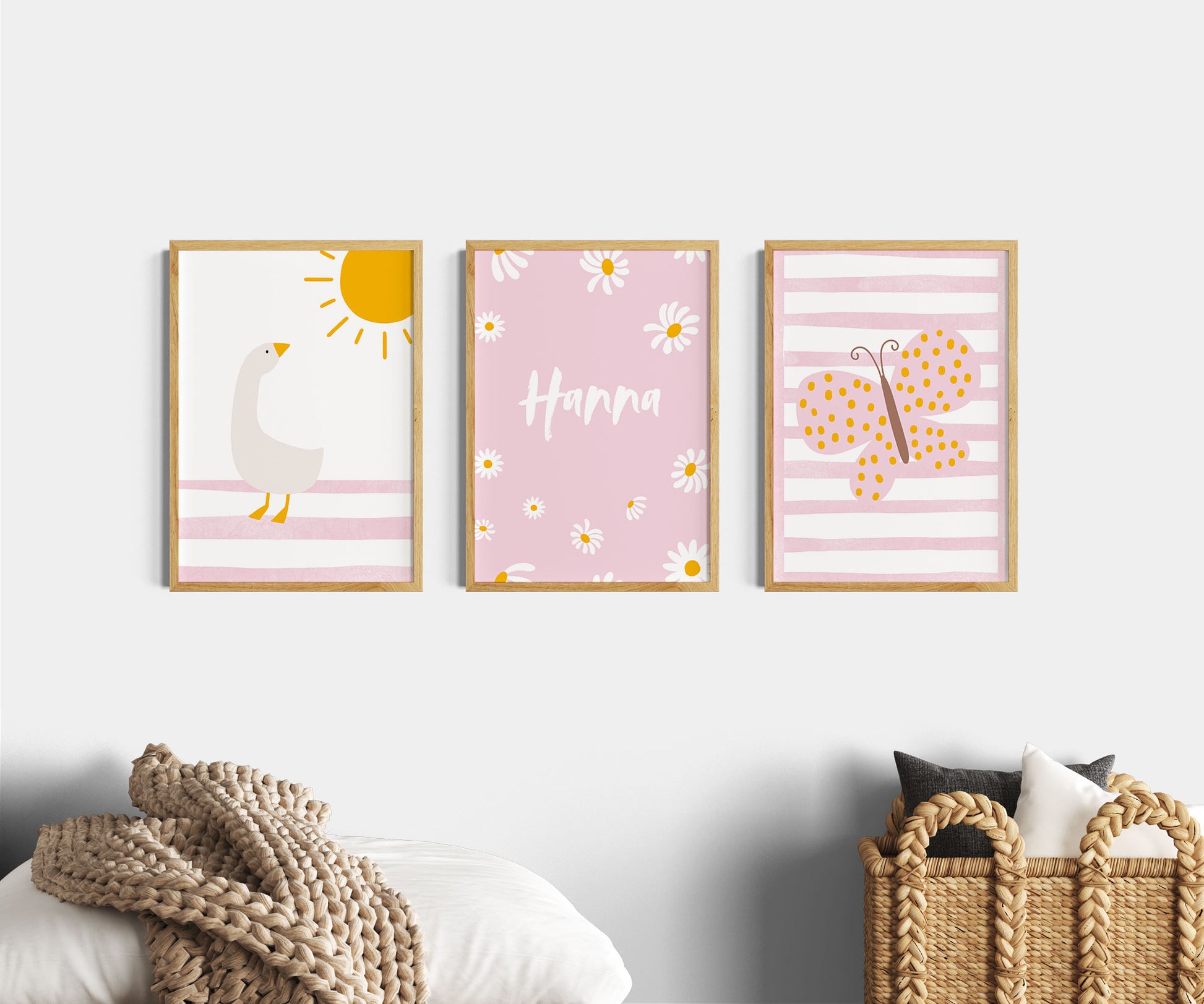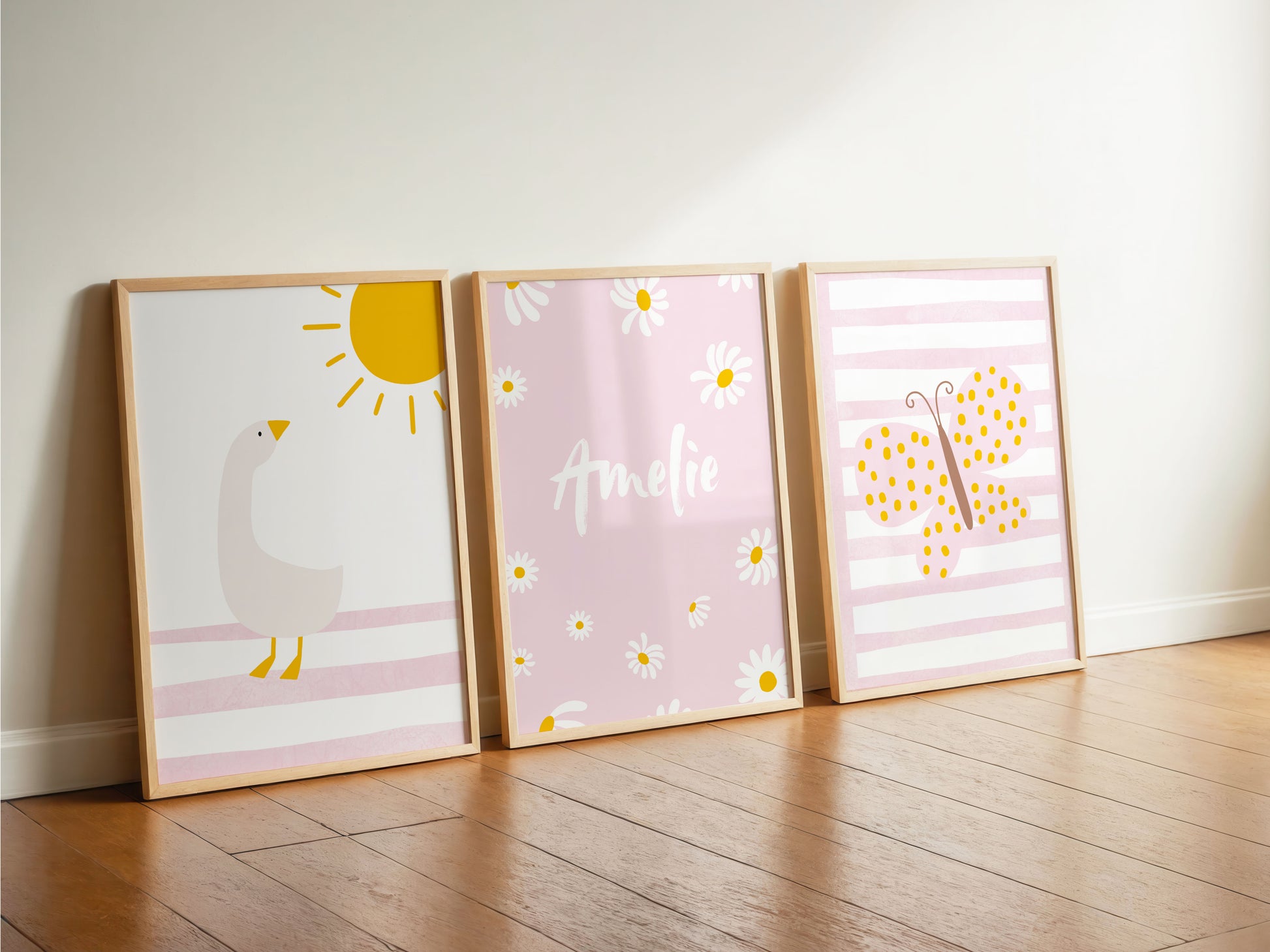 3er Tier Poster als Set mit einer süßen Gans und Sonne, dem Namen mit Gänseblümchen und einem schönen Schmetterling als Boho Wanddeko für das Kinderzimmer bzw. Mädchenzimmer. Diese edlen rosa Wandbilder eignen sich zudem als Geschenk für Mädchen bzw. Kinder und Kitakinder.