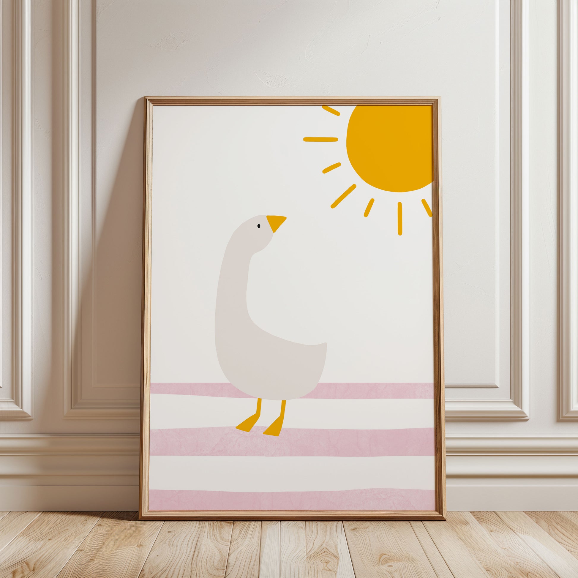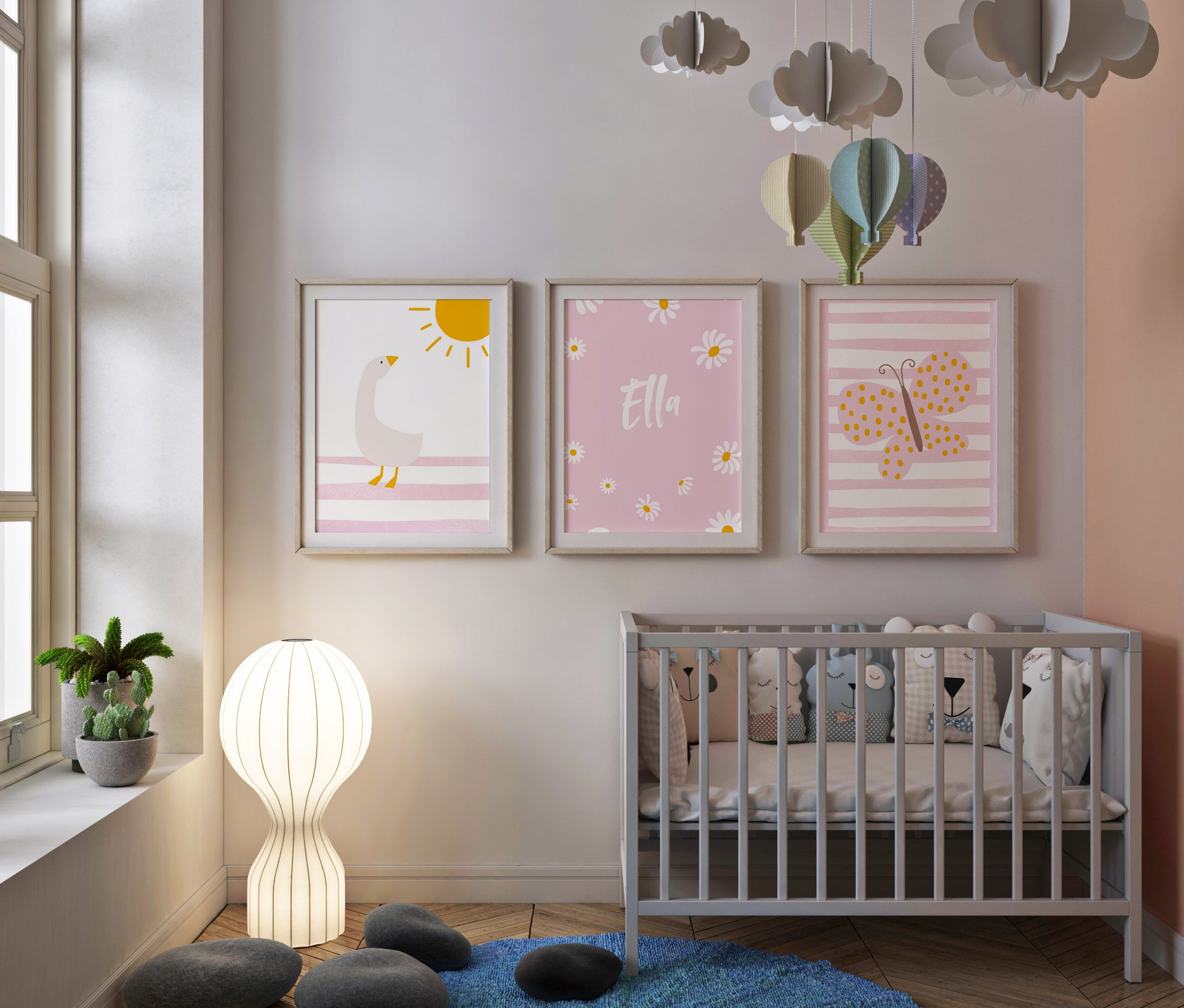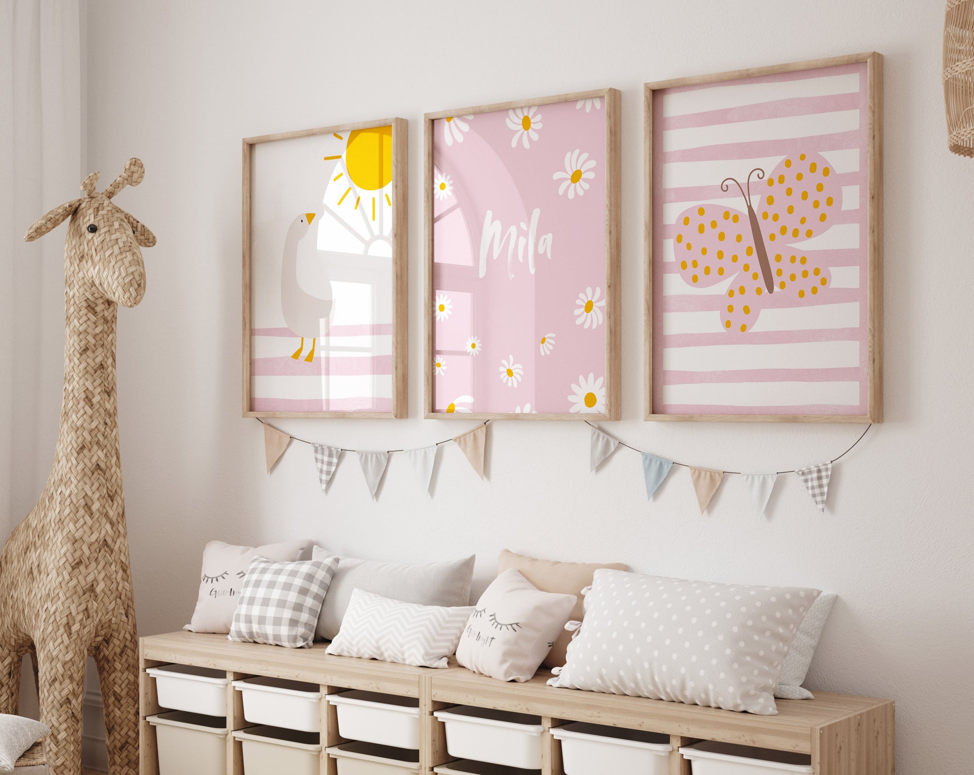3er Tier Poster als Set mit einer süßen Gans und Sonne, dem Namen mit Gänseblümchen und einem schönen Schmetterling als Boho Wanddeko für das Kinderzimmer bzw. Mädchenzimmer. Diese edlen rosa Wandbilder eignen sich zudem als Geschenk für Mädchen bzw. Kinder und Kitakinder.