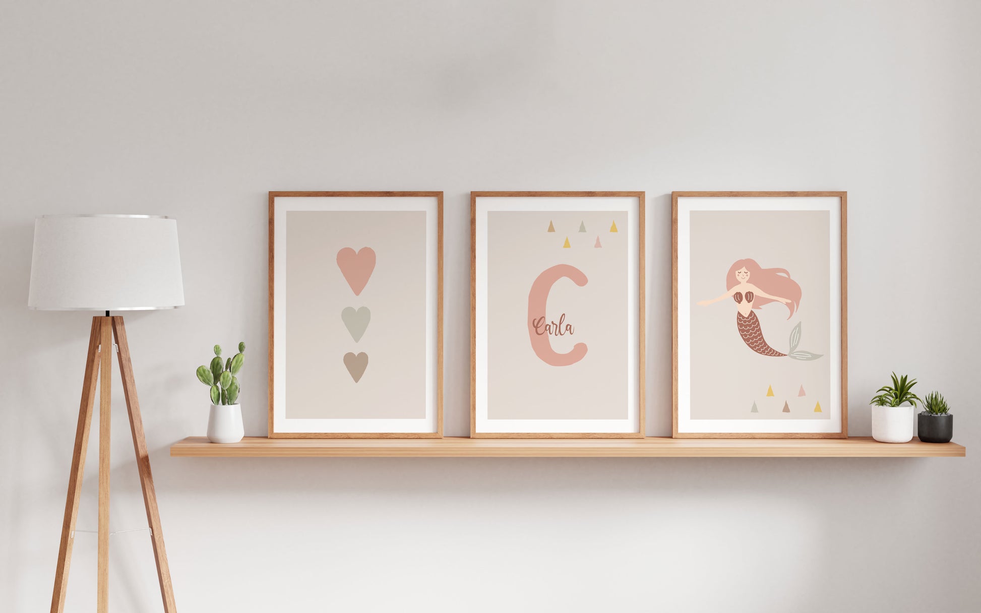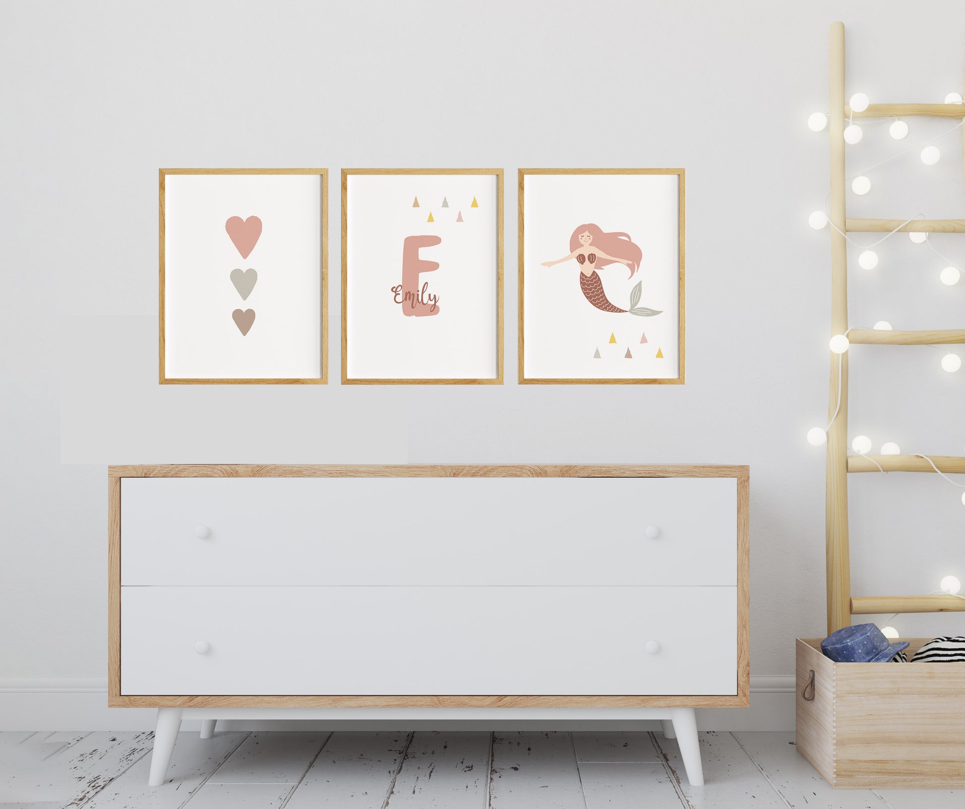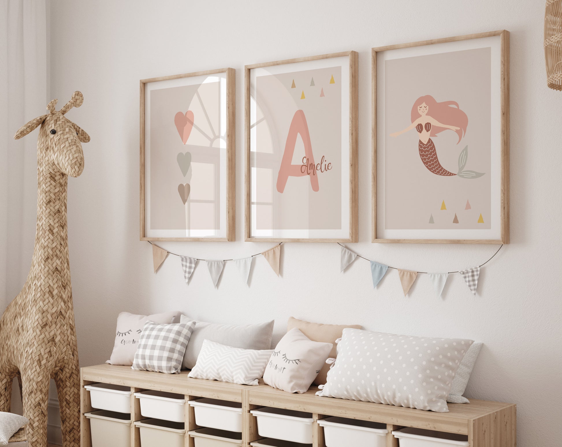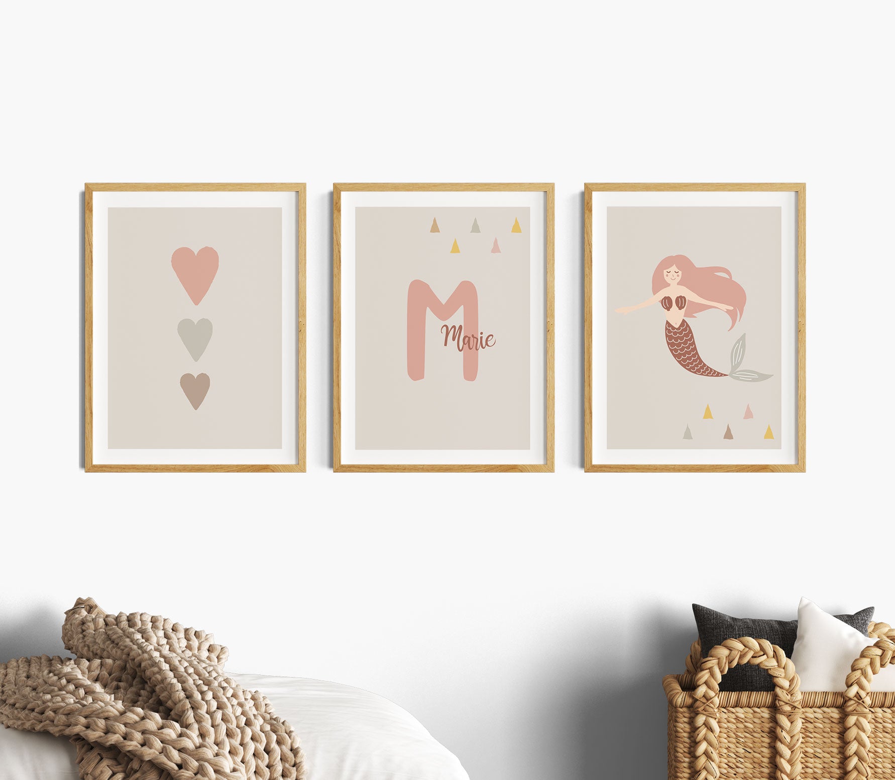 Verleihen Sie dem Kinderzimmer einen Hauch von Magie und Stil mit unserem bezaubernden 3er Posterset. Dieses liebevoll gestaltete Set kombiniert entzückende Herzmotive, den Namen Ihres Kindes und eine zauberhafte Meerjungfrau – ideal für alle kleinen Träumerinnen! 🧜🏼