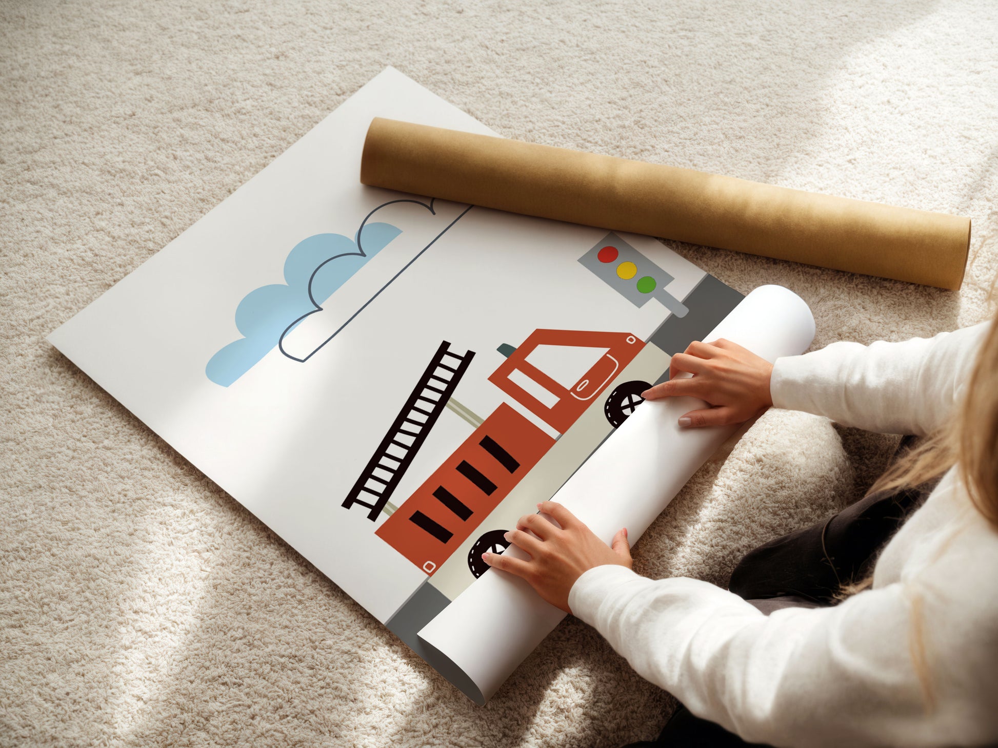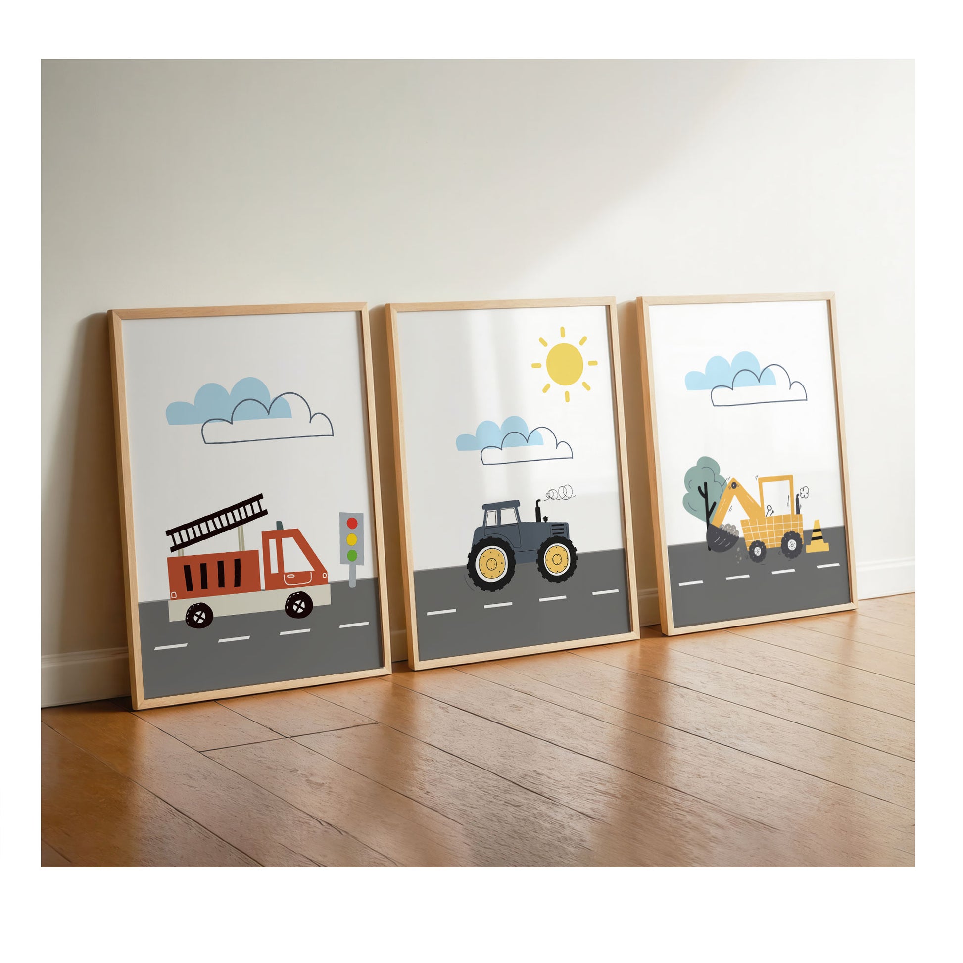 Das 3er Posterset mit einem Feuerwehrwagen (optional Polizeiauto), Traktor und einem Bagger verschönert jedes Kinderzimmer, Babyzimmer, Jungenzimmer und Spielzimmer! Diese Bilder eignen sich nicht nur als Wandgestaltung im skandinavischen Stil, sondern auch als Geschenkidee für Kleinkinder, Kinder und zur Taufe oder Geburtstag (z.B. ersten Geburtstag).