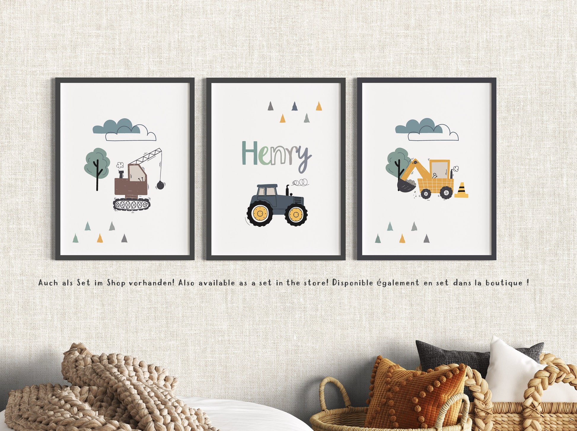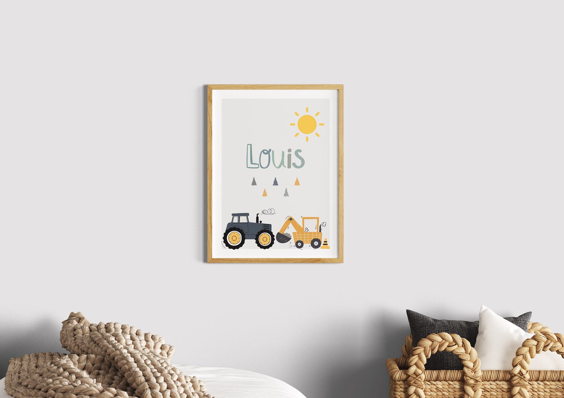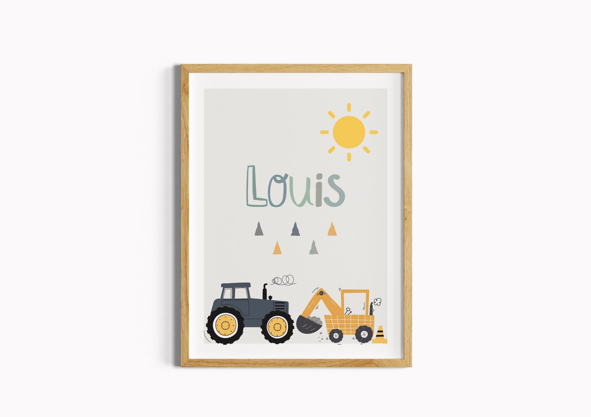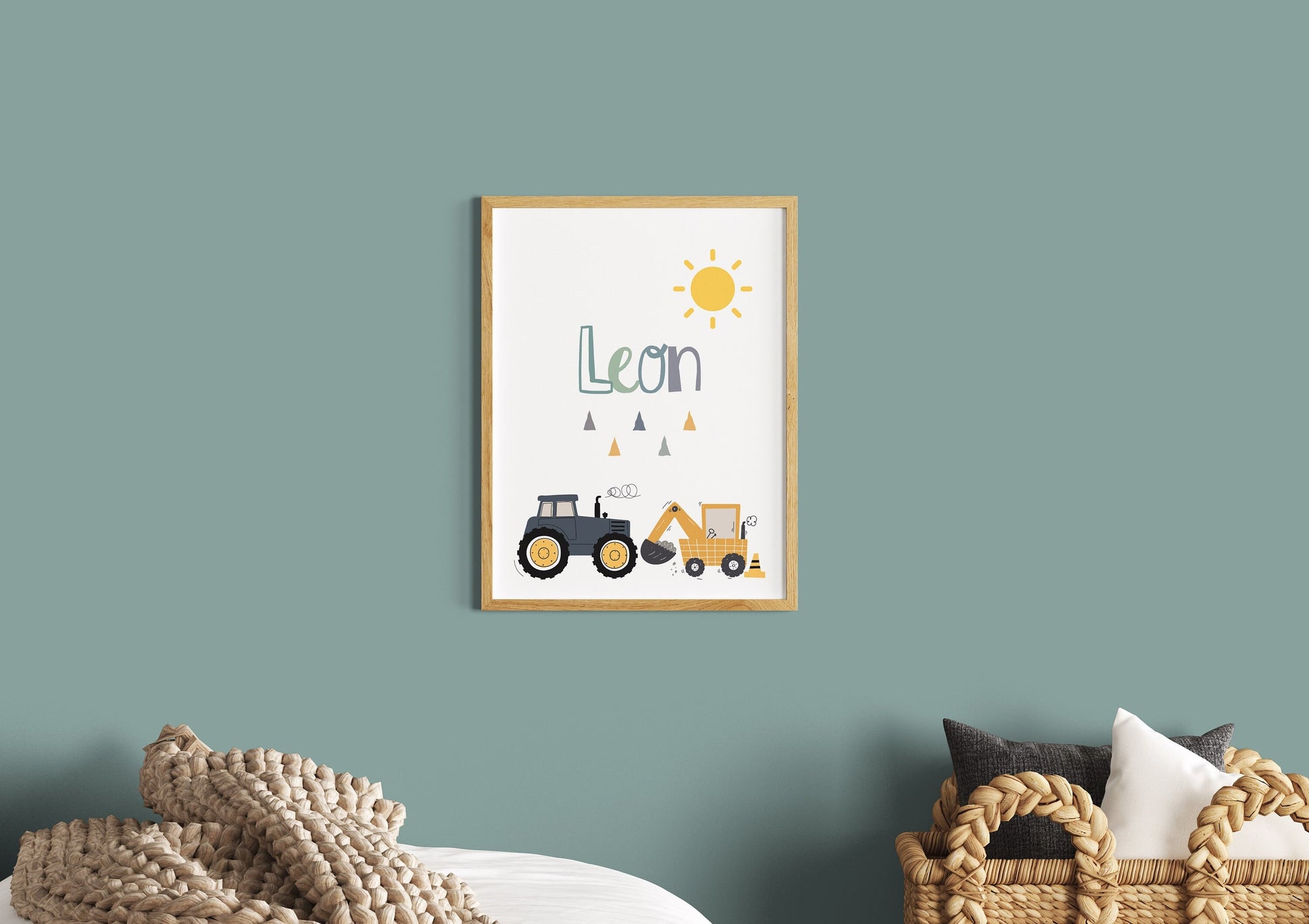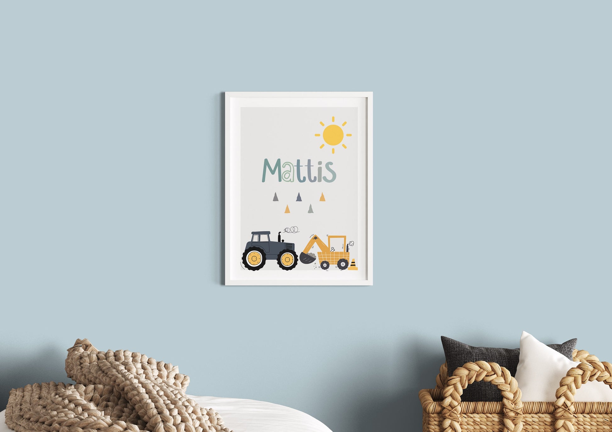 Kinderzimmer Namensposter bzw. Geburtsposter mit einem Traktor, Bagger, Name und einer Sonne für Jungen als beige, grüne, graue und gelbe Kinderzimmerdeko im Kinderzimmer oder Babyzimmer oder als Geschenkidee für ein Kind.