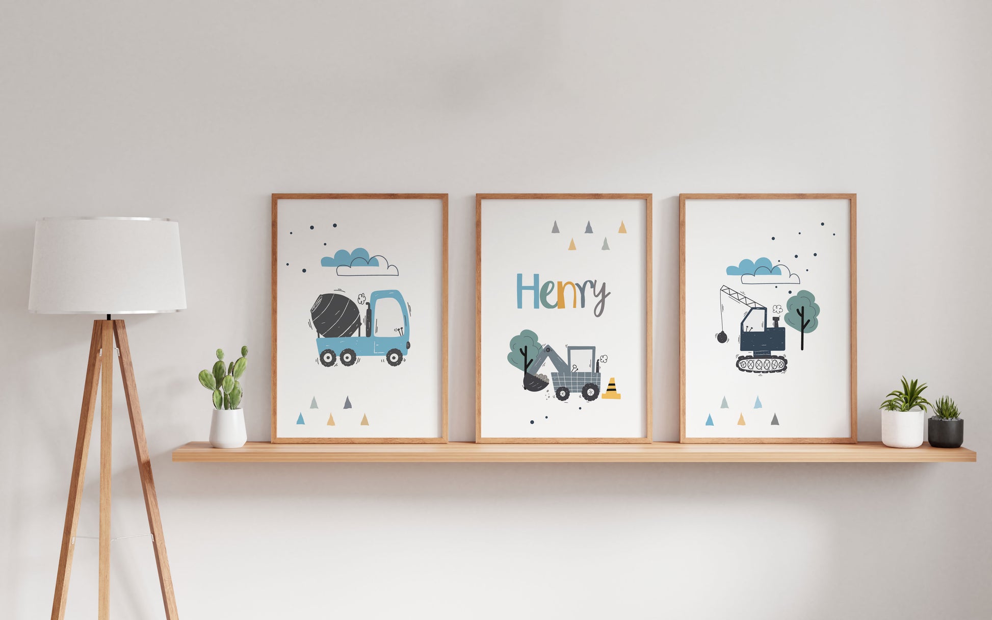 Kinderzimmerposter für Jungen personalisiert mit Namen als blaue, gelbe und graue Wandgestaltung und Kinderzimmerdeko im Kinderzimmer, Spielzimmer oder Babyzimmer mit drei beliebten Fahrzeugen wie z.B. einem Bagger auf der Baustelle. Zwei Varianten stehen zur Verfügung, eine davon ist mit einem besonderen Kinderspruch.