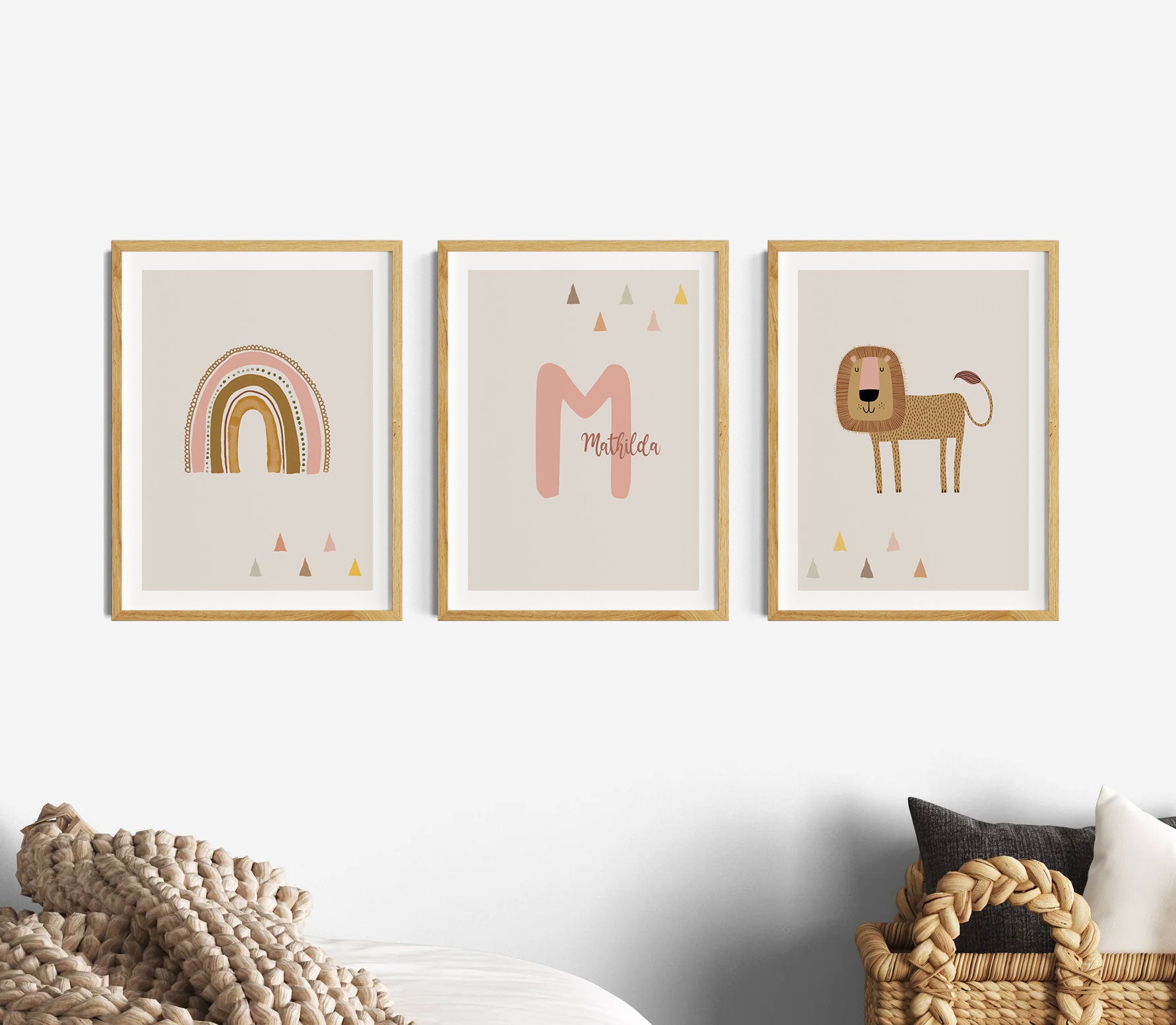 Das 3er Bilder Set in Altrosa für das Mädchenzimmer oder Babyzimmer zeigt auf drei Bildern als beige oder graue Wanddeko einen Regenbogen, den Namen mit Initialen und einem süßen Löwen in aquarellen Pastelltönen.
