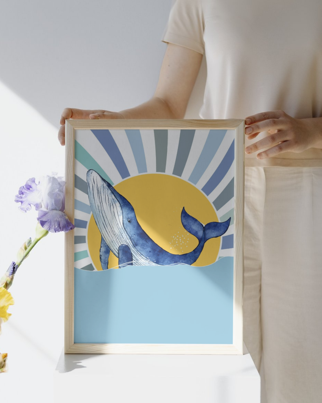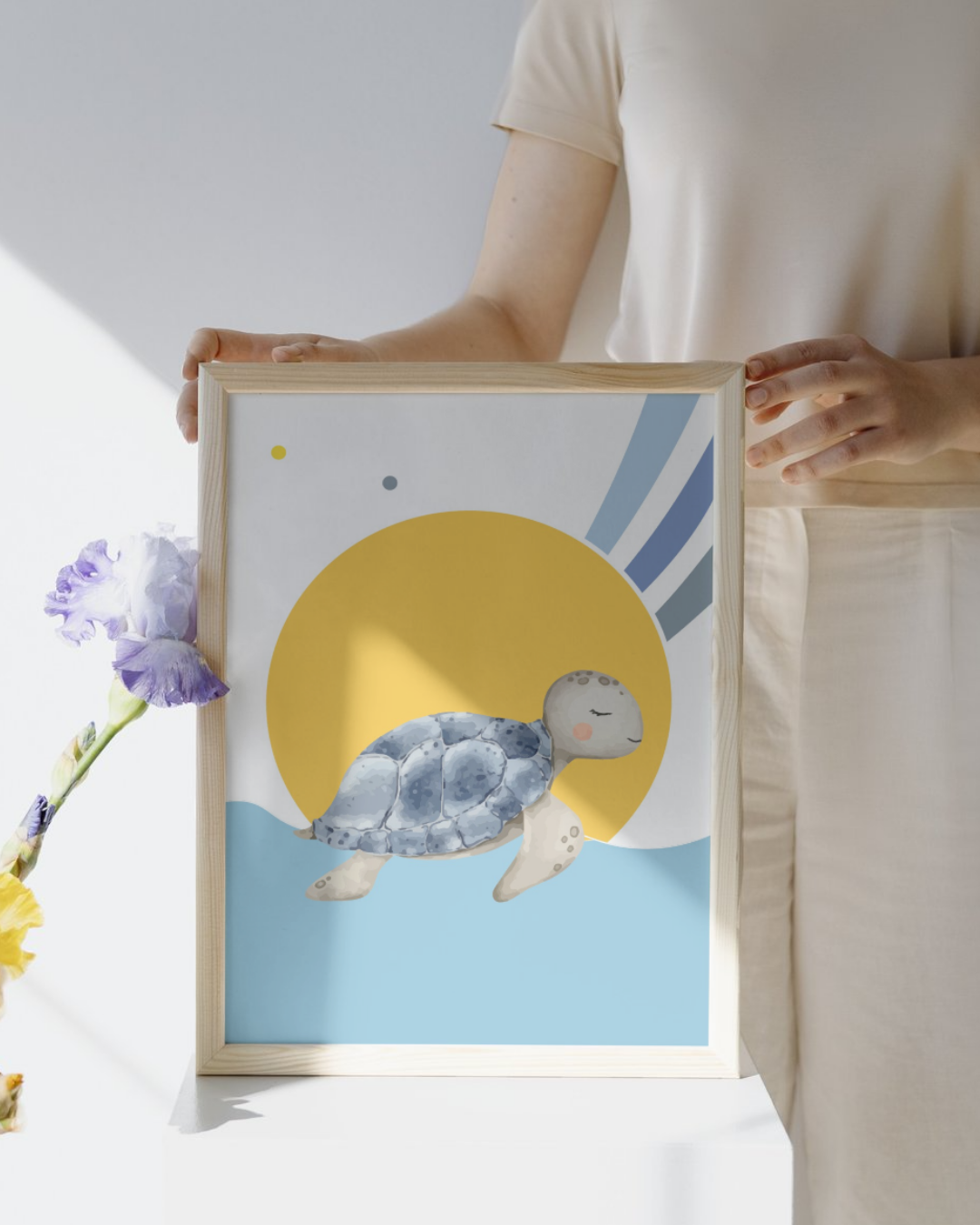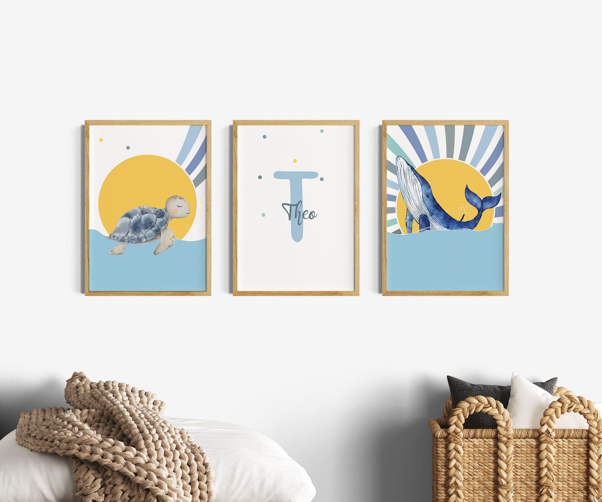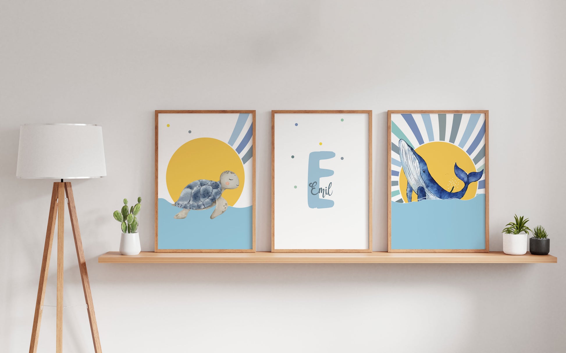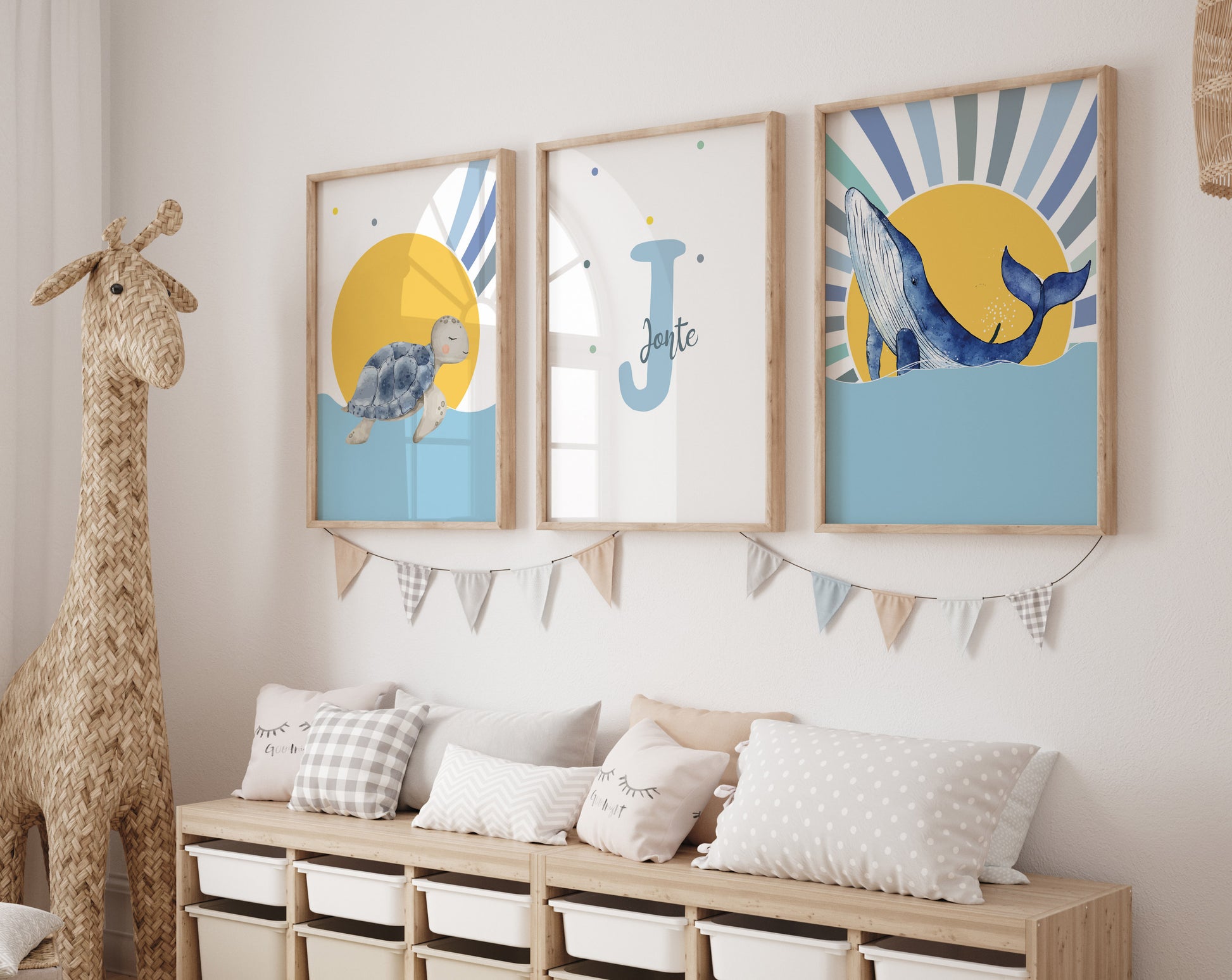 Das maritime 3er Posterset mit süßen Meerestieren: Einer Schildkröte, dem Namen und einem Wal mit einer Sonne im asiatischen retro Look verzaubert jedes Kinderzimmer bzw. Jungenzimmer. Diese vintage Wandbilder eignen sich nicht nur als Kinderzimmerdeko, sondern auch als Geschenkidee für Kleinkinder, Kinder und zur Taufe oder Geburtstag (z.B. ersten Geburtstag).